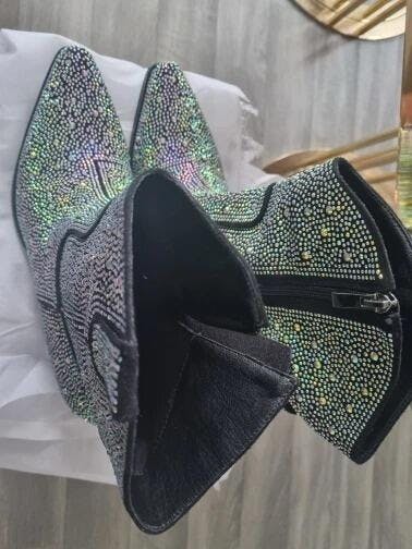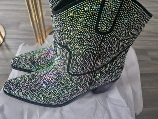Estas bota é 100% Idêntica à foto e é ainda melhor pessoalmente. Chegou dentro do prazo. As pedras de strass se destacam com qualquer roupa. A bota é larguinha, o que é uma vantagem, fácil de colocar, não houve problemas com o zíper; e dá pra usar meias grossas com ela. Eu recomendo a compra.