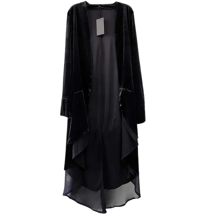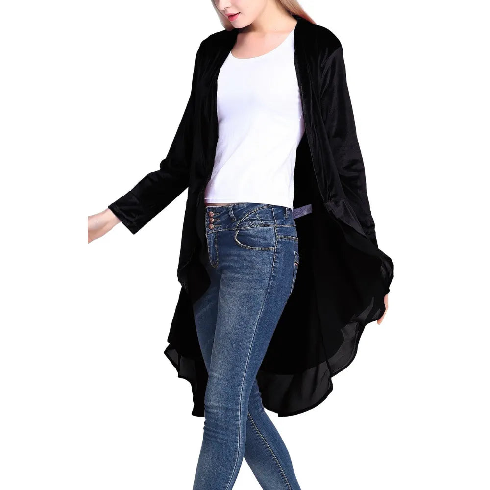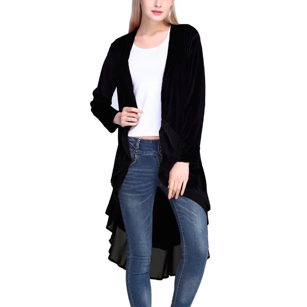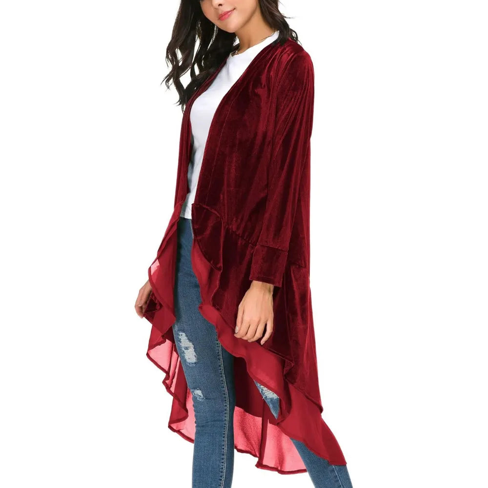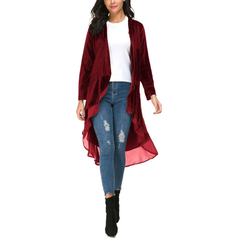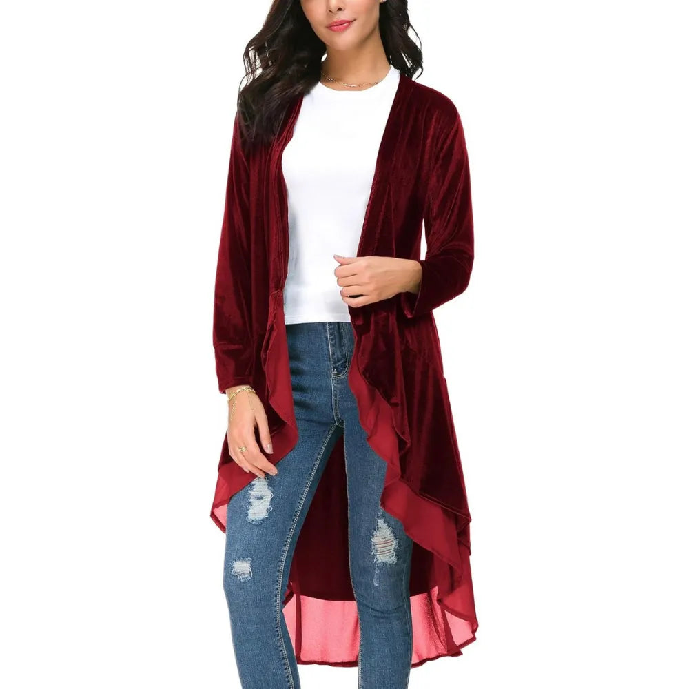 O Sobretudo Longo Veludo Com Babado Chiffon é a escolha perfeita para quem busca um visual marcante, feminino e versátil. Feito em veludo macio com acabamento fluido em chiffon, essa peça une glamour e conforto na medida certa. Perfeito para sobreposições estilosas do dia à noite, seja com jeans, vestidos ou peças mais clássicas. Disponível nas cores atemporais preto e vinho, é aquele tipo de peça que transforma qualquer look básico em um verdadeiro statement de moda.