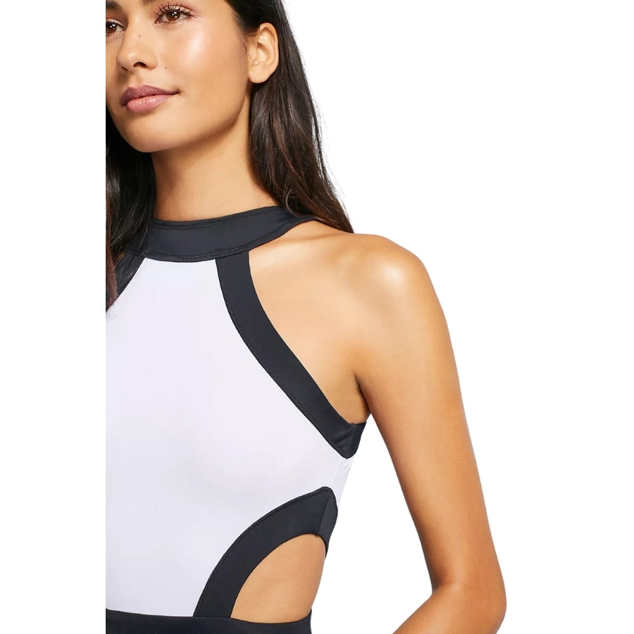 O Maiô Regata Geométrico Preto e Branco aposta no contraste gráfico para esculpir a silhueta: o corte regata de gola garante sustentação do busto, enquanto as faixas pretas contornam decote, cavas e cintura, desenhando linhas geométricas que criam efeito de ampulheta. Recortes laterais estratégicos, logo acima da faixa, revelam a pele com sutileza, ao passo que a parte inferior branca com bordas pretas alonga as pernas. Confeccionado em poliéster com elastano, abraça as curvas com elasticidade suave, possui forro macio e seca rapidamente — combinação perfeita de elegância e conforto para praia ou piscina.