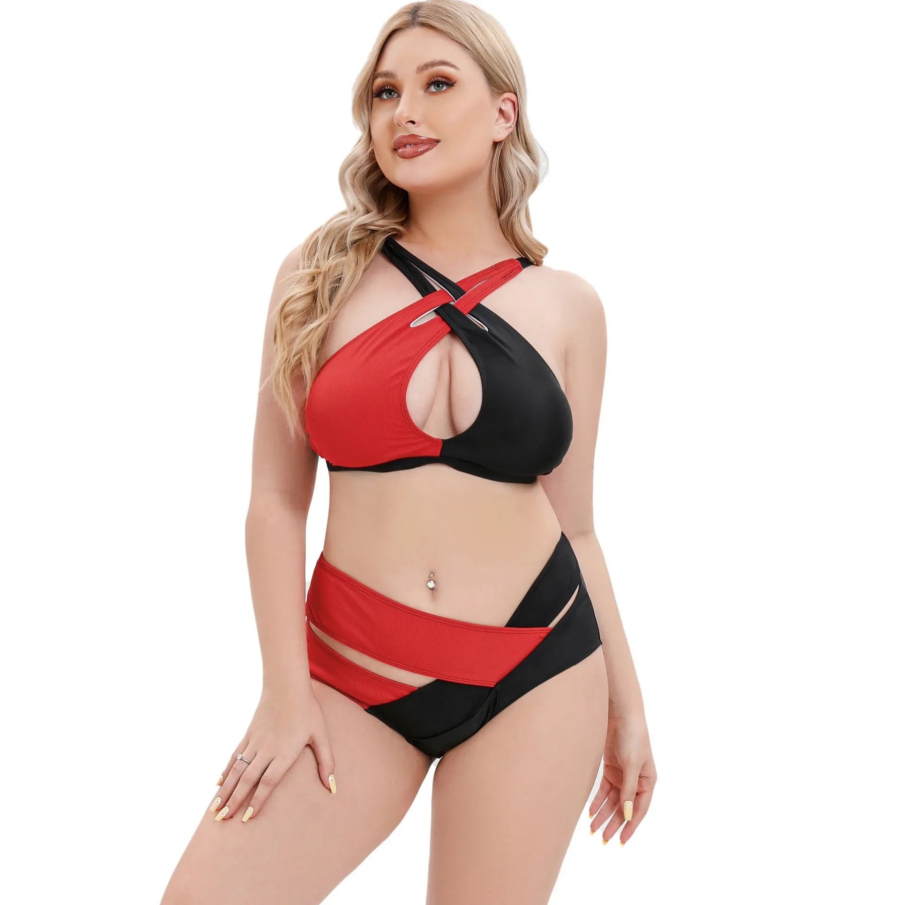 O Biquíni Plus Size Cruzado Red & Black une ousadia e conforto: o top apresenta alças largas que cruzam sobre o colo, criando um recorte keyhole central e color block vermelho-preto. A base elástica sustenta com segurança, enquanto bojos macios permitem ajuste personalizado. A calcinha de cintura alta repete o jogo de cores com faixas diagonais e recortes vazados, modelando a silhueta e disfarçando a região abdominal. Confeccionado em poliéster com elastano, oferece toque suave, ótima elasticidade e secagem rápida — perfeito para destacar curvas na praia ou pool party.