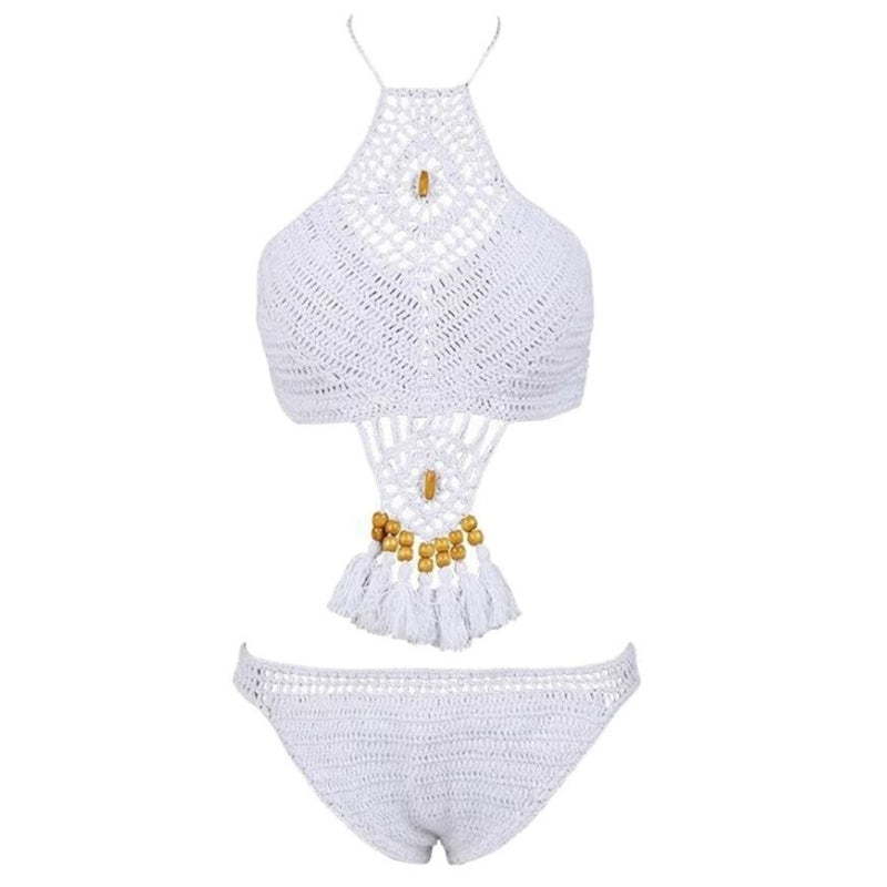 O Biquíni Crochê Artesanal Com Miçangas é trabalhado à mão: top halter com desenho vazado e miçangas douradas costuradas, unido à calcinha por faixa rendada com franjas longas que balançam ao caminhar. A combinação de pontos artesanais, recorte central e detalhes de contas cria um look resort chic, fresco e cheio de personalidade.