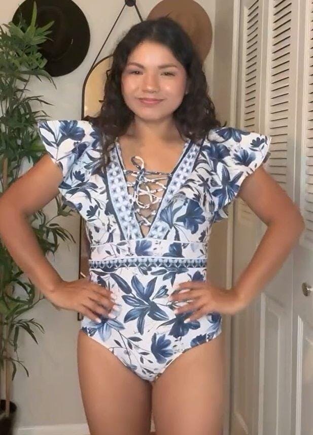 Maiô azul floral Com babados delicados nos ombros, decote elegante e estampa romântica para moda praia feminina