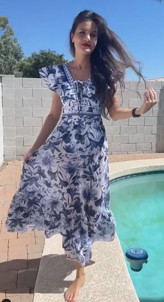 Maiô Porcelana Com Babados Azul Floral com Saída de Praia - Poderosa